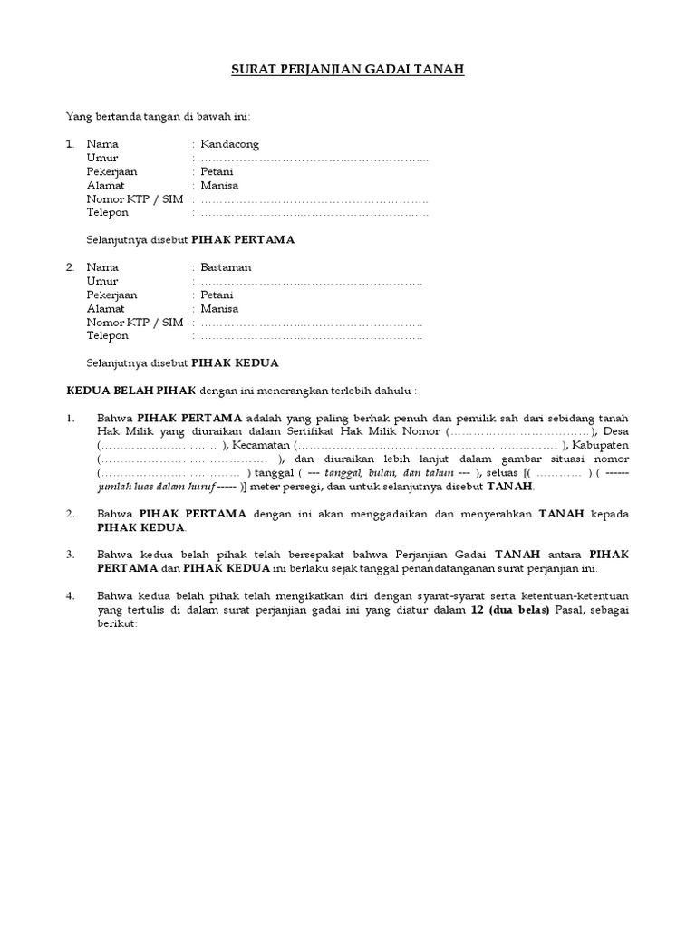 Bahwa kedua belah pihak telah bersepakat bahwa perjanjian gadai tanah antara pihak pertama dan pihak kedua ini berlaku sejak tanggal penandatanganan surat perjanjian ini. Sangat menmbantu kami dalam perjanjian gadai. Check spelling or type a new query. Tidak itu saja, masukkan beberapa saksi minimum berumur 15 tahun, sehat secara psikis, dan sedang tidak ditahan karena satu kasus supaya validitasnya makin kuat. Berikut contoh surat gadai tanah yang benar dan baik.